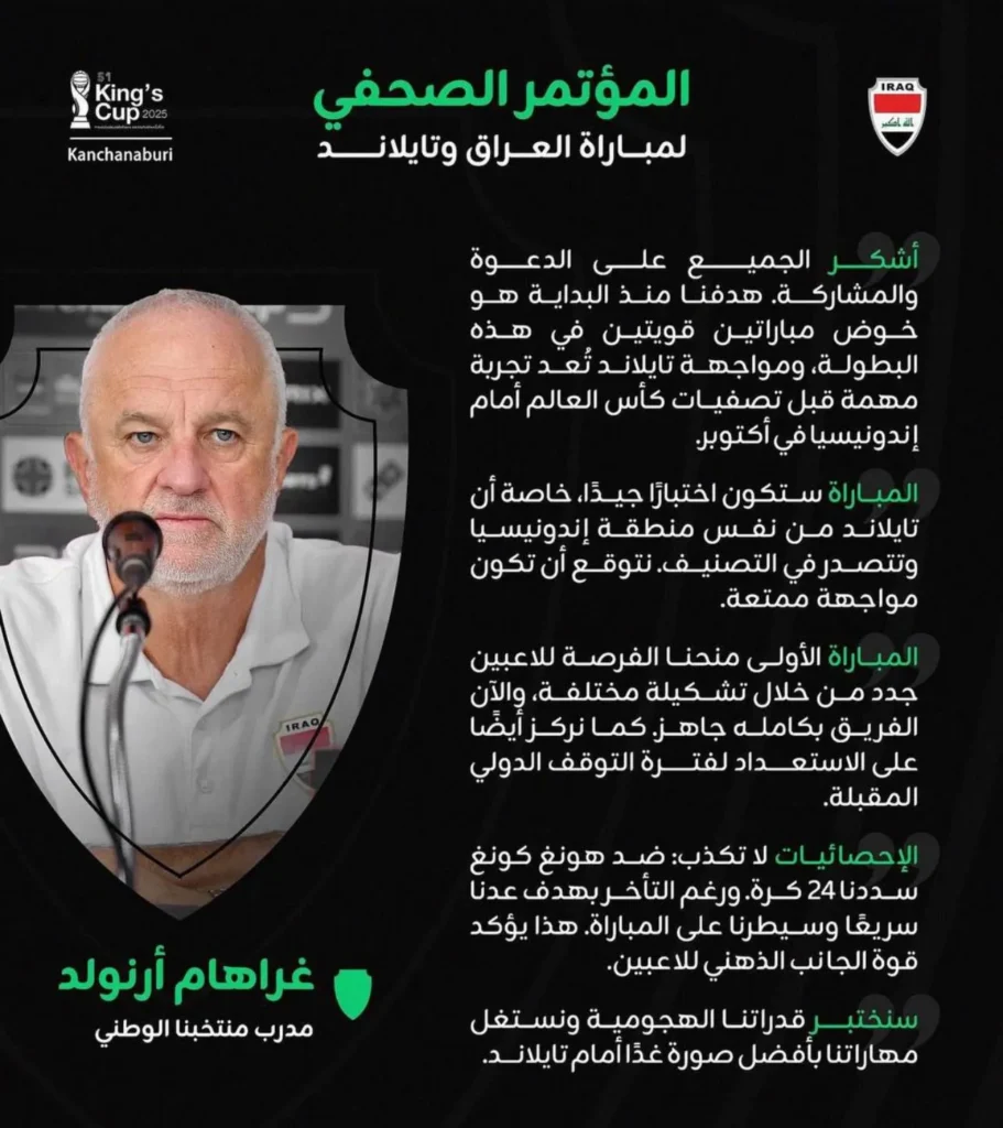 وشدد مدرب المنتخب على أن لقاء تايلاند يشكل محطة مهمة في التحضيرات للاستحقاقات المقبلة، مؤكداً ثقته باللاعبين وقدرتهم على تقديم مستوى يليق باسم الكرة العراقية.