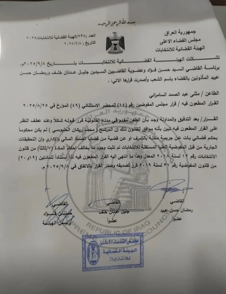 وبحسب وثيقة قضائية، فقد ردّت الهيئة الطعن المقدَّم من النائب مثنى السامرائي ضد ترشيح الحلبوسي، مؤكدة سلامة الإجراءات القانونية الخاصة بترشحه.