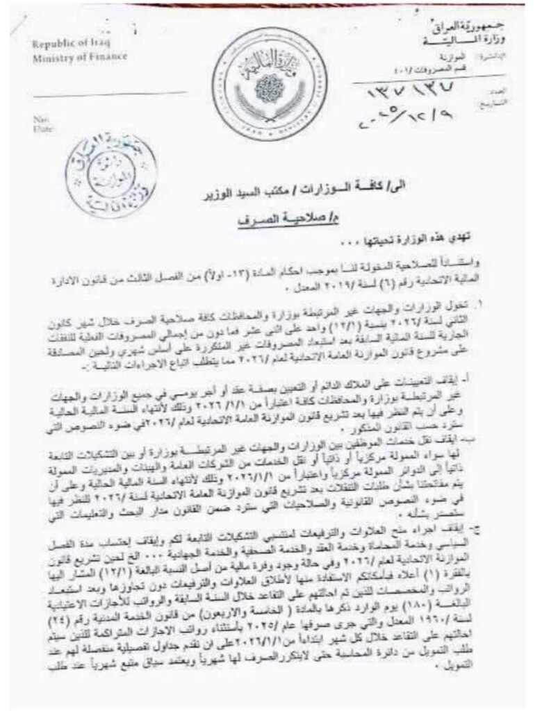 ويأتي هذا التوجيه في إطار السعي لضبط النفقات وتحقيق التوازن المالي خلال العام الجديد، فيما من المتوقع أن تصدر الوزارة لاحقاً تفاصيل إضافية حول آليات التنفيذ والفئات المشمولة بالقرار.